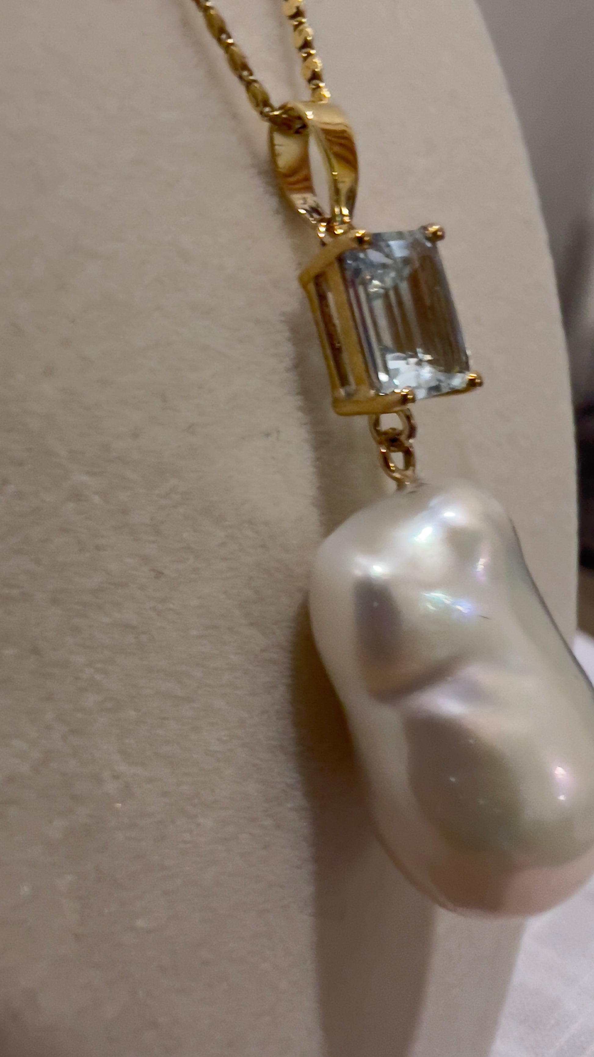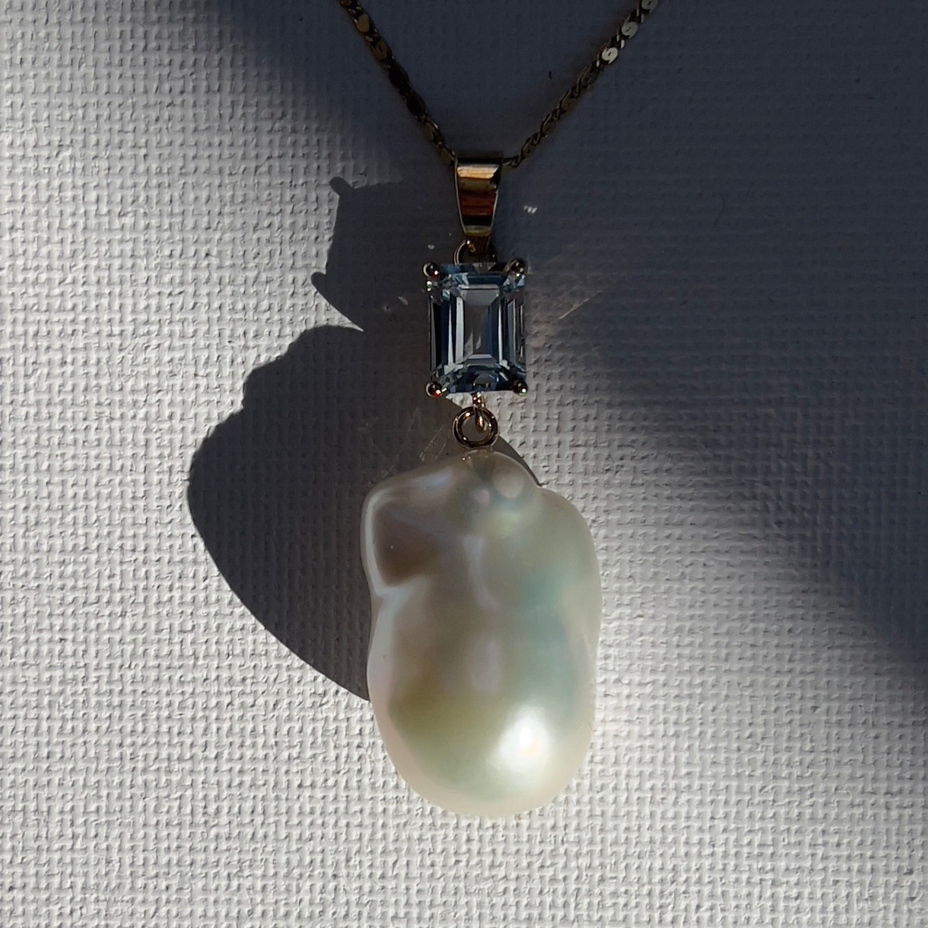 A luminous baroque freshwater pearl, anchored by an emerald-cut aquamarine — suspended in your choice of yellow gold, white gold, or silver. Wear it solo as a quiet statement or layer it with fine chains. Designed for everyday, elevated enough for evening.